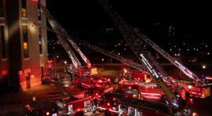 Firefighters ascended extension ladders to reach Yawkey’s roof and climb through windows on the building’s top floor as crowds of students gathered below to watch.